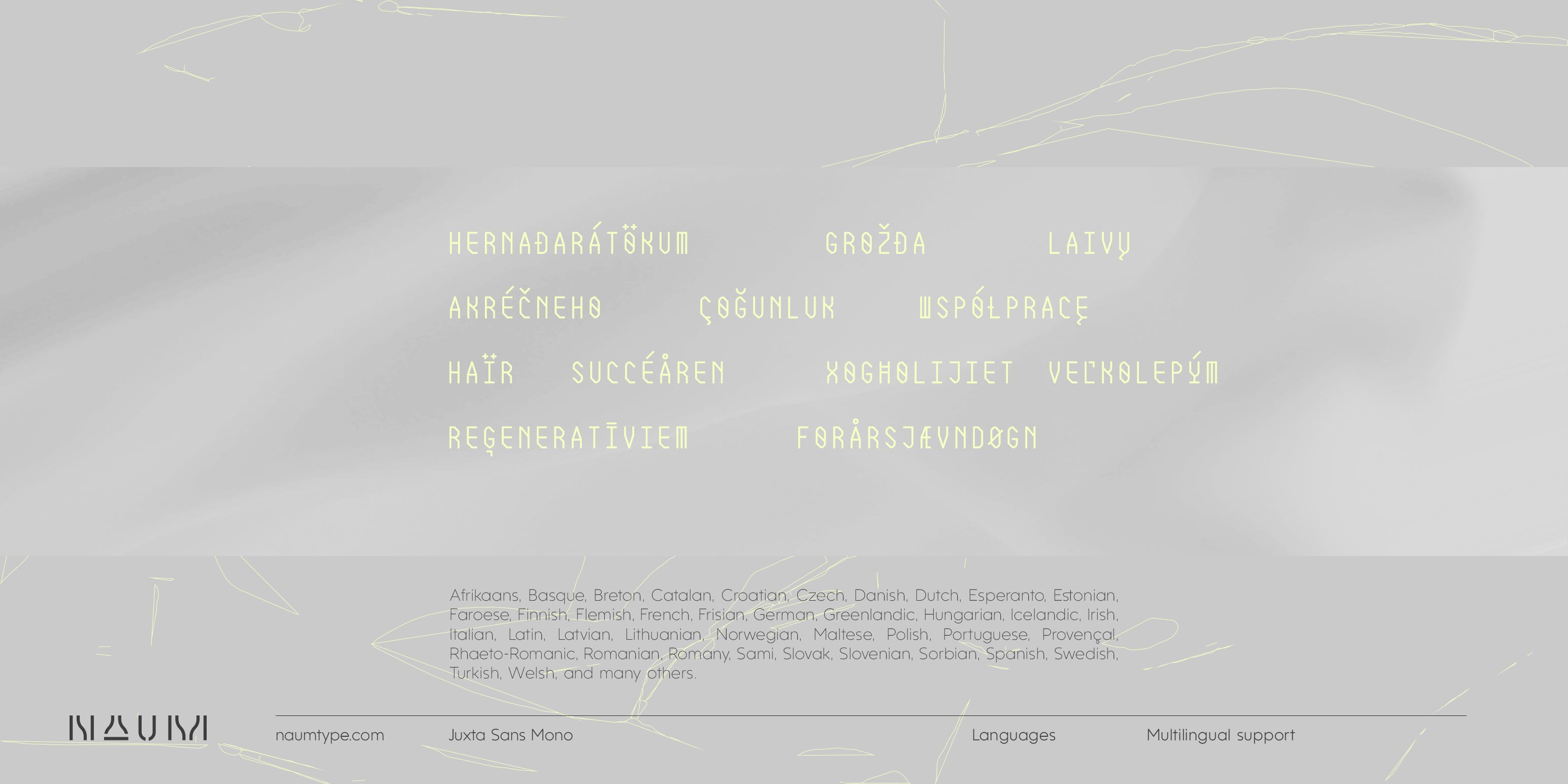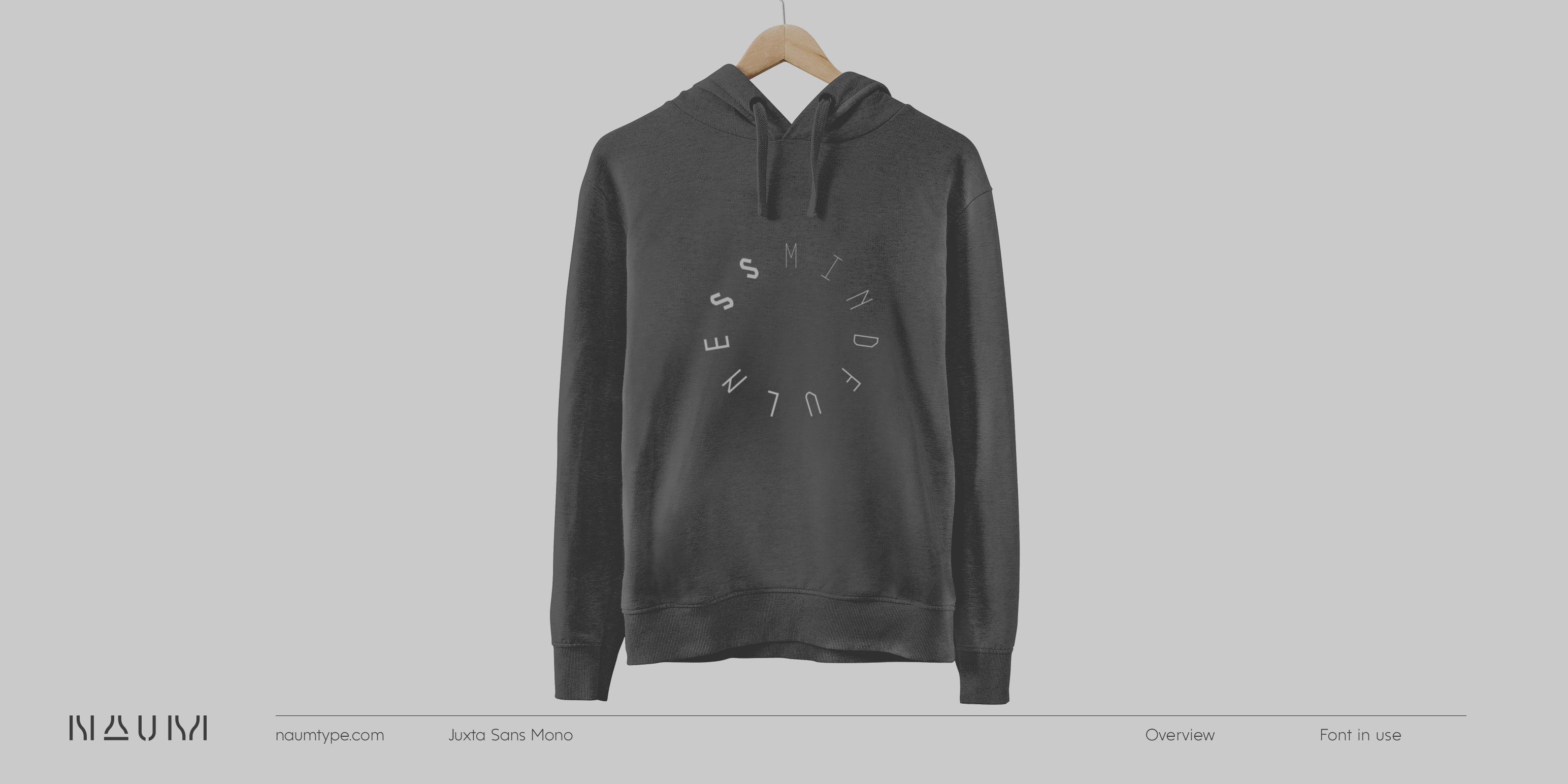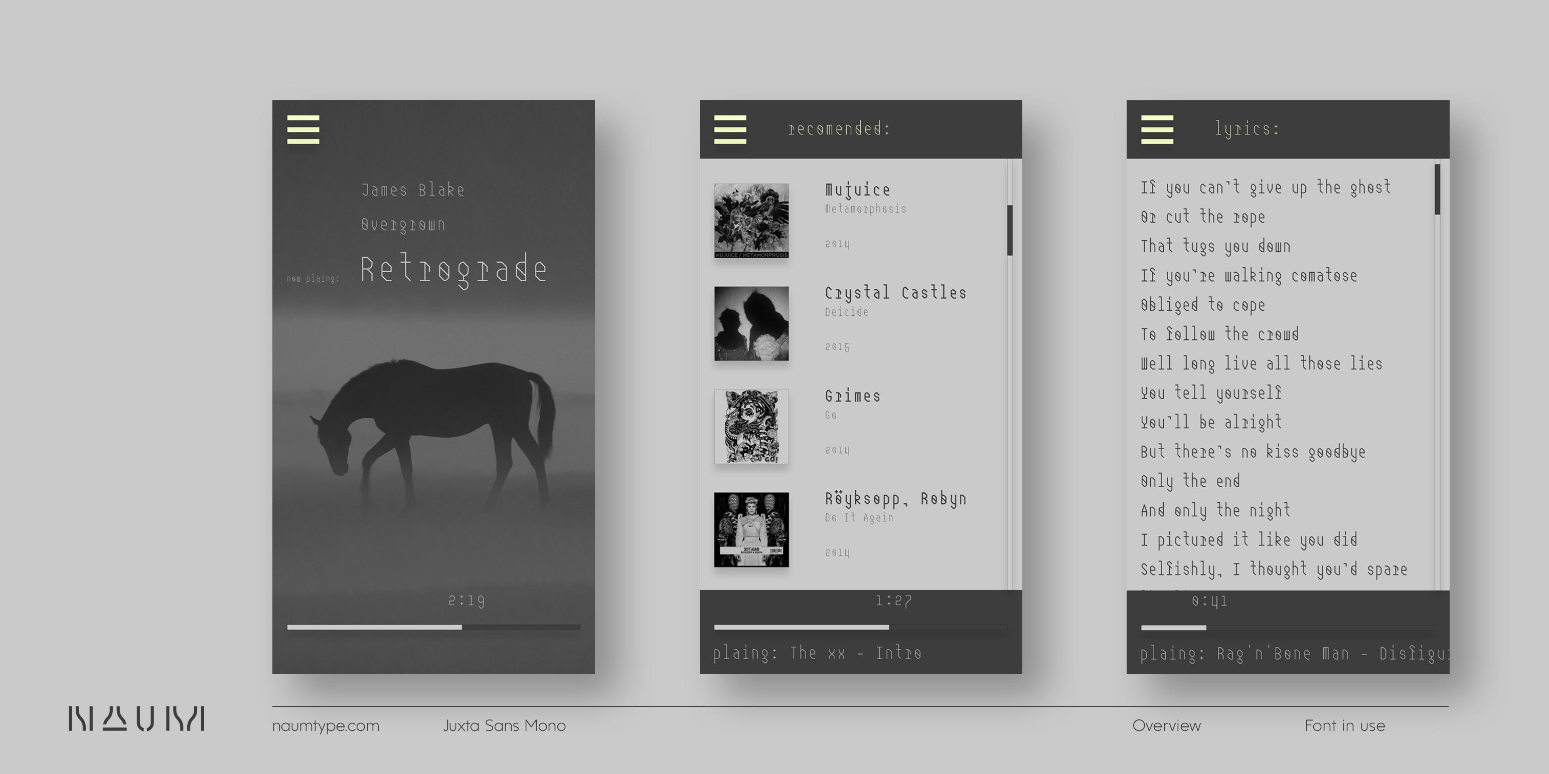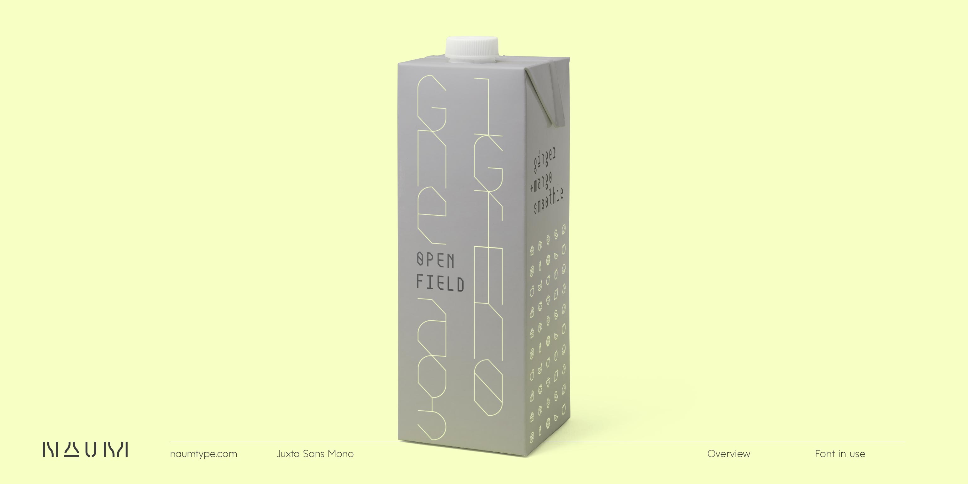 Juxta Sans Mono is an experimental monospace sans, an extension of the Juxta superfamily.