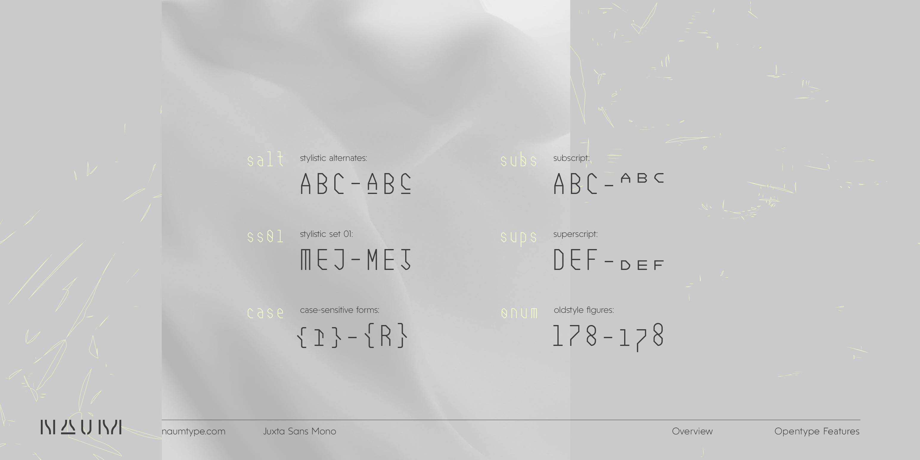 During the creation of the Juxta script, I felt that the aesthetics and the main idea of the font had promising potential and I started thinking about a pair for it. So the idea of Juxta Sans Mono was formulated.